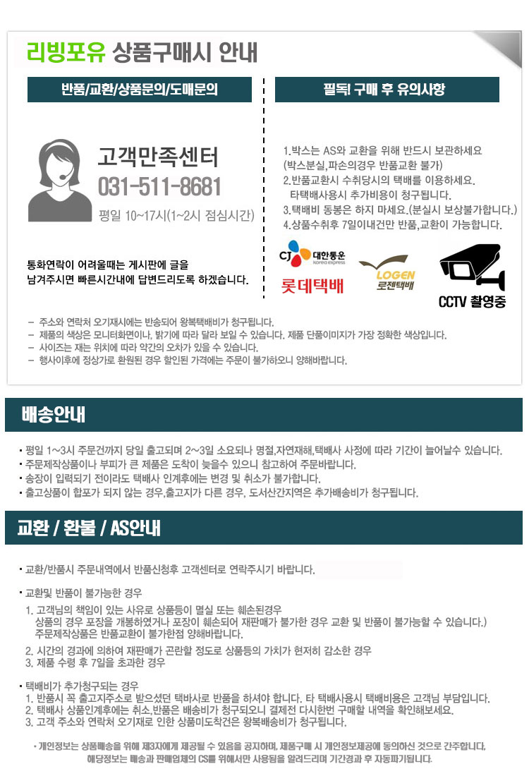 • - 교환/반품 안내: 고객변심 및 주문착오에 의한 교환/반품은 제품 수령일로부터 7일 이내 가능합니다.